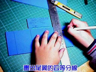 1. 將量取裁剪好的泡棉圓套板,平均劃出四片尾翼的位置。