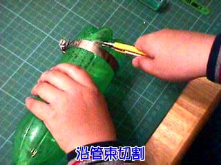 2. 在此介紹站長的切割手法,在機械五金行,購買不鏽鋼管束,尺寸可套入及鎖緊瓶子,鎖緊時管束會自行水平定位且不會滑動,以美工刀靠管束邊切割即可,一次解決。