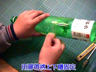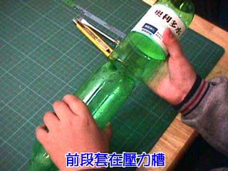 1. 將切除瓶底及裝上頭錐的上瓶與充氣用的下瓶套合。