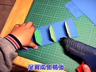 2. 黏尾翼時,翼片必須與圓套板成90度角垂直,用膠量先少一些,固定好了再補強一點。
