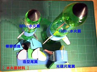 4. 尾翼材料可利用泡棉板、硬紙板、塑膠板、燒壞的光碟片製作。(左圖600cc的水火箭的尾翼就是用光碟片製作,類似魚鰭翼)