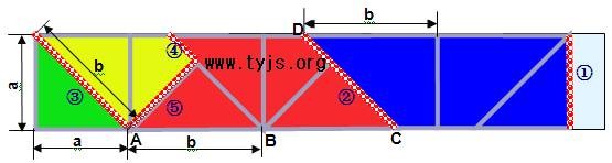 初識(shí)“四巧板”,結(jié)構(gòu)簡(jiǎn)單,但仔細(xì)探究,卻奧妙無(wú)窮。本人根據(jù)市面購(gòu)得的“四巧板”產(chǎn)品,獲得了“四巧板”圖形(見(jiàn)圖1中的四巧板)。咋一看圖形,四塊板不一樣,也無(wú)聯(lián)系,無(wú)從下手。經(jīng)過(guò)研究分析發(fā)現(xiàn):四塊板圖形緊密相扣,互相依存。圖1中四巧板結(jié)構(gòu)圖顯示:四塊板的每一塊都是由同樣的基本單元(等腰直角三角形)圖形組合而成,或者說(shuō)整個(gè)“四巧板”是由相同的4個(gè)等腰直角三角形和相應(yīng)的4個(gè)直角梯形組合而成。通過(guò)引導(dǎo)學(xué)生分析可以看到,在“四巧板”的分解圖形中能找到3種線段:1)直角三角形的斜邊長(zhǎng)b;2)直角邊長(zhǎng)a;3)斜邊和直角邊兩長(zhǎng)度之差(b-a)。這樣,在整個(gè)“四巧板”的緊密結(jié)構(gòu)中,所形成的長(zhǎng)方形的寬長(zhǎng)之比就是:a:4b=1:4√2≈1:6,因?yàn)椤八那砂濉彼邪遄拥慕嵌榷际?/span>45度的倍數(shù),所有板子的邊長(zhǎng)都是斜邊和直角邊的加減,加上板子方向的變化,就形成了4塊板子千變?nèi)f化的組合。細(xì)細(xì)數(shù)來(lái),四塊板子總共有16條邊,其中有6個(gè)斜邊,5個(gè)直角邊,2個(gè)雙倍斜邊長(zhǎng)的邊,2個(gè)斜邊和直角邊之差長(zhǎng)的邊,1個(gè)斜邊和差之和長(zhǎng)的邊,形成了嚴(yán)謹(jǐn)?shù)目茖W(xué)性,也激發(fā)起了學(xué)生對(duì)智慧追求的巨大動(dòng)力。