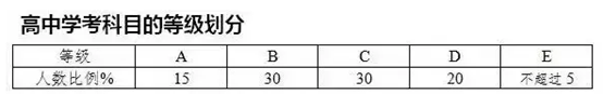 成績呈現(xiàn):高中學(xué)考成績采用等級制,設(shè)[**]、B、C、D、E5個等級,E為不合格。以卷面得分為依據(jù),[**]、B、C等按實(shí)考人數(shù)15%、30%、30%最接近的累計(jì)比例劃定,E等比例不超過5%。