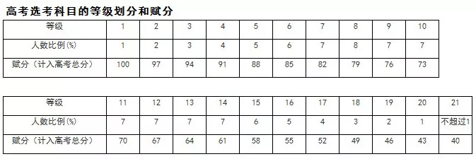 成績呈現(xiàn):考生各科成績按等級賦分,起點(diǎn)賦分40分,滿分100分,共分21個等級,每個等級分差為3分。