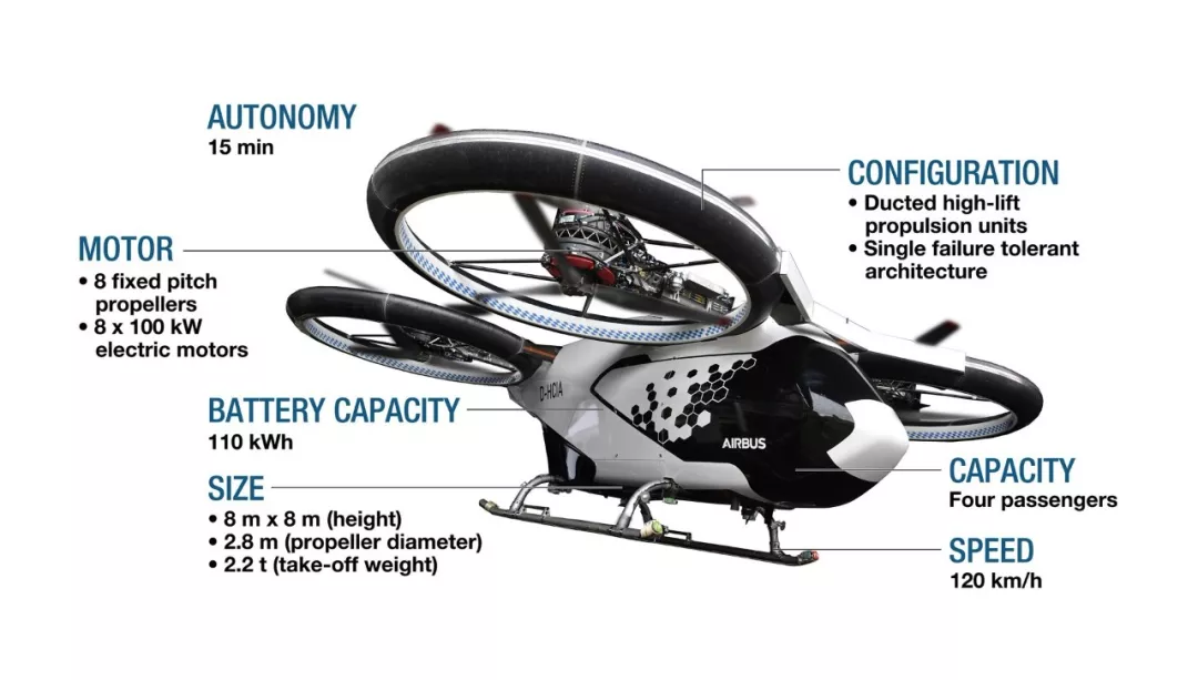 該飛行器采用全電動(dòng)驅(qū)動(dòng)方式,以滿足低噪音、零排放的環(huán)保要求,儲(chǔ)能系統(tǒng)為4枚電壓為800伏的電池,總?cè)萘繛?10kWh,為固定在機(jī)身上的4組同軸反轉(zhuǎn)涵道風(fēng)扇提供動(dòng)力,風(fēng)扇直徑為2.8米,距離地面的高度達(dá)5英尺。City [**]irbus的電機(jī)、電力電子設(shè)備由西門子公司提供。