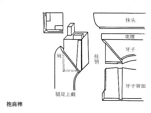 指有束腰家具的腿足與束腰、牙條相結(jié)合時(shí)所用的榫卯。從外形看,此榫的斷面是半個(gè)銀錠形的掛銷,與開牙條背面的槽口套掛,從而使束腰及牙條結(jié)實(shí)穩(wěn)定。抱肩榫的做法采用45°,榫肩出榫和打眼,嵌入的牙條與腿足構(gòu)成同一層面,是有束腰的明清家具的常用卯榫構(gòu)造。